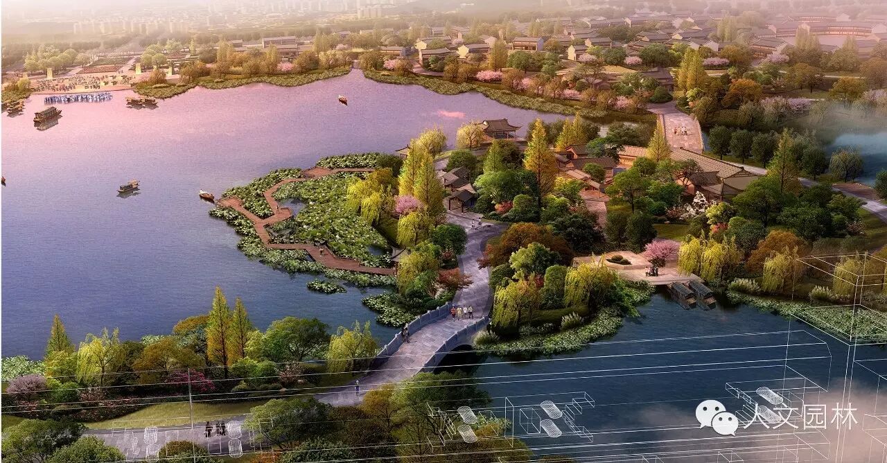 瀛洲观荷衔接了商业水街与司马追风阁,设置木栈道、瀛洲榭等,每至夏日,临湖赏荷。