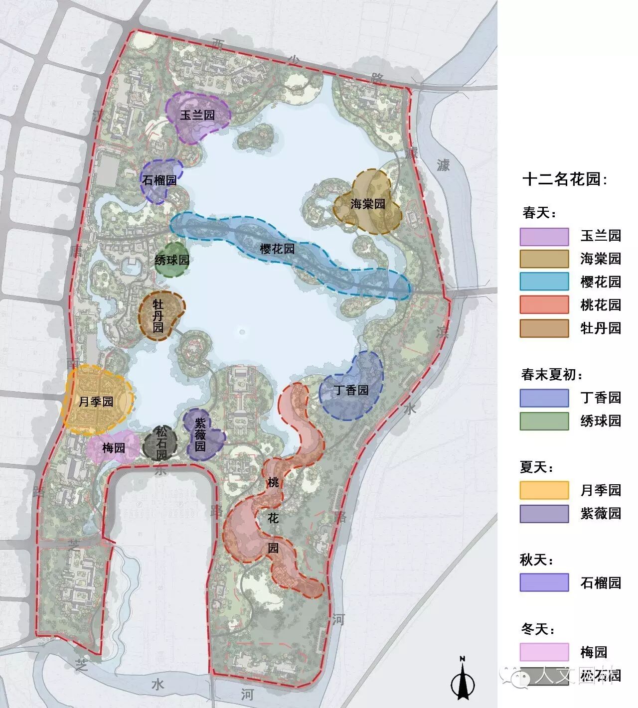 十二园:玉兰园、海棠园、樱花园、桃花园、丁香园、绣球园、月季园、紫薇园、石榴园、松石园、牡丹园、梅园。